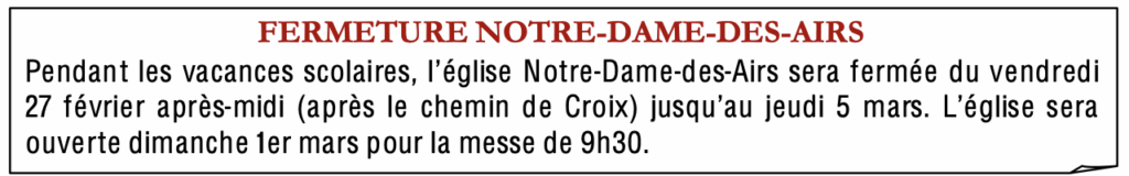 La chapelle du Sacré-Cœur (Adoration perpétuelle) est fermée du 21 février au 8 mars 2026.